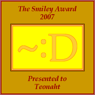 We're all human, and life is busy, but if even one person can manage to hold onto their dream, there's hope for all of us—even if we happen to indulge in creating languages for no justifiable purpose. For that reason, and many more, I take my hat off to Sally Caves, and am proud to award the 2007 Smiley Award to Teonaht. Long live the Teonim!